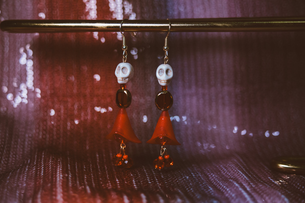 From my annual Muertitos Earrings collection, Muertito Damita is wearing a red dress. Made with czech glass, iron findings and silicone earring backs.