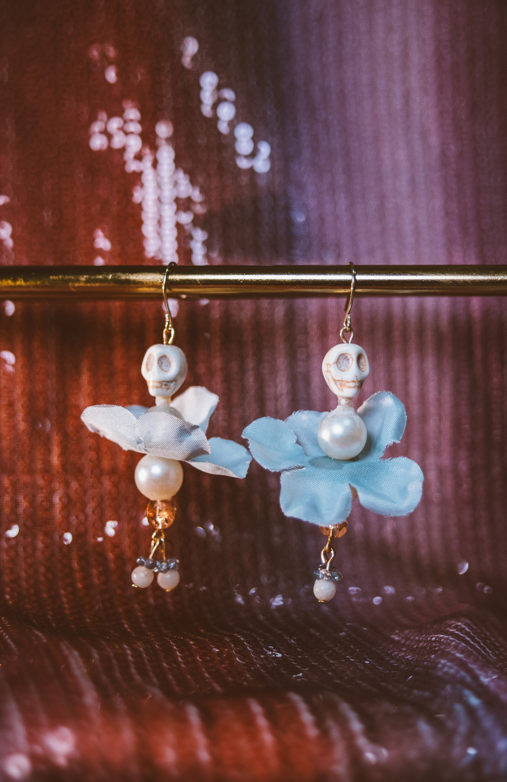 From my annual Muertitos Earrings collection, Muertito Florecita Azul is made with cloth faux flower petals, plastic pearl beads and czech glass beads. Iron findings and silicone earring backs.